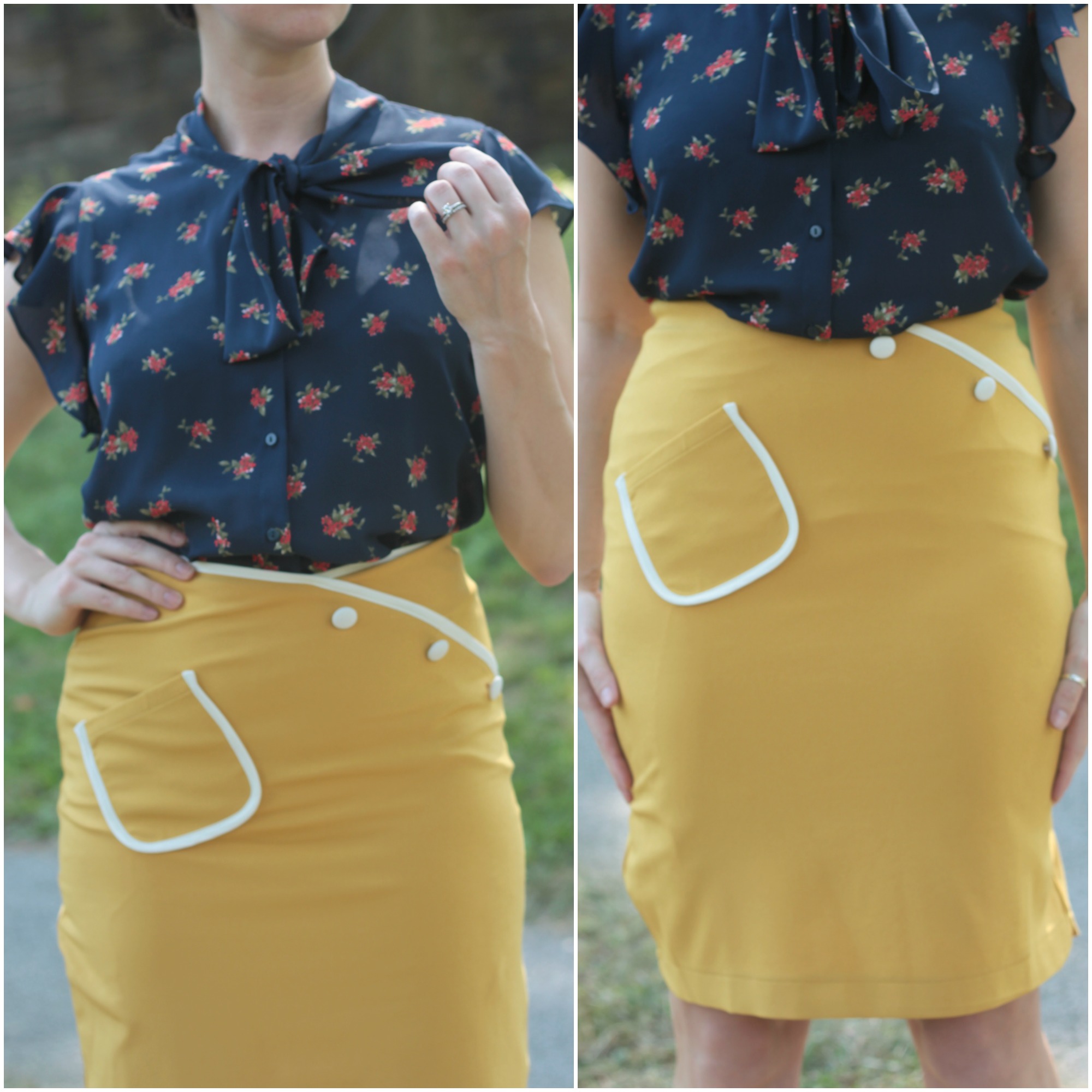What could be sweet like this?  How about a ruffled shirt and yellow pencil skirt? Sounds pretty sweet to me.