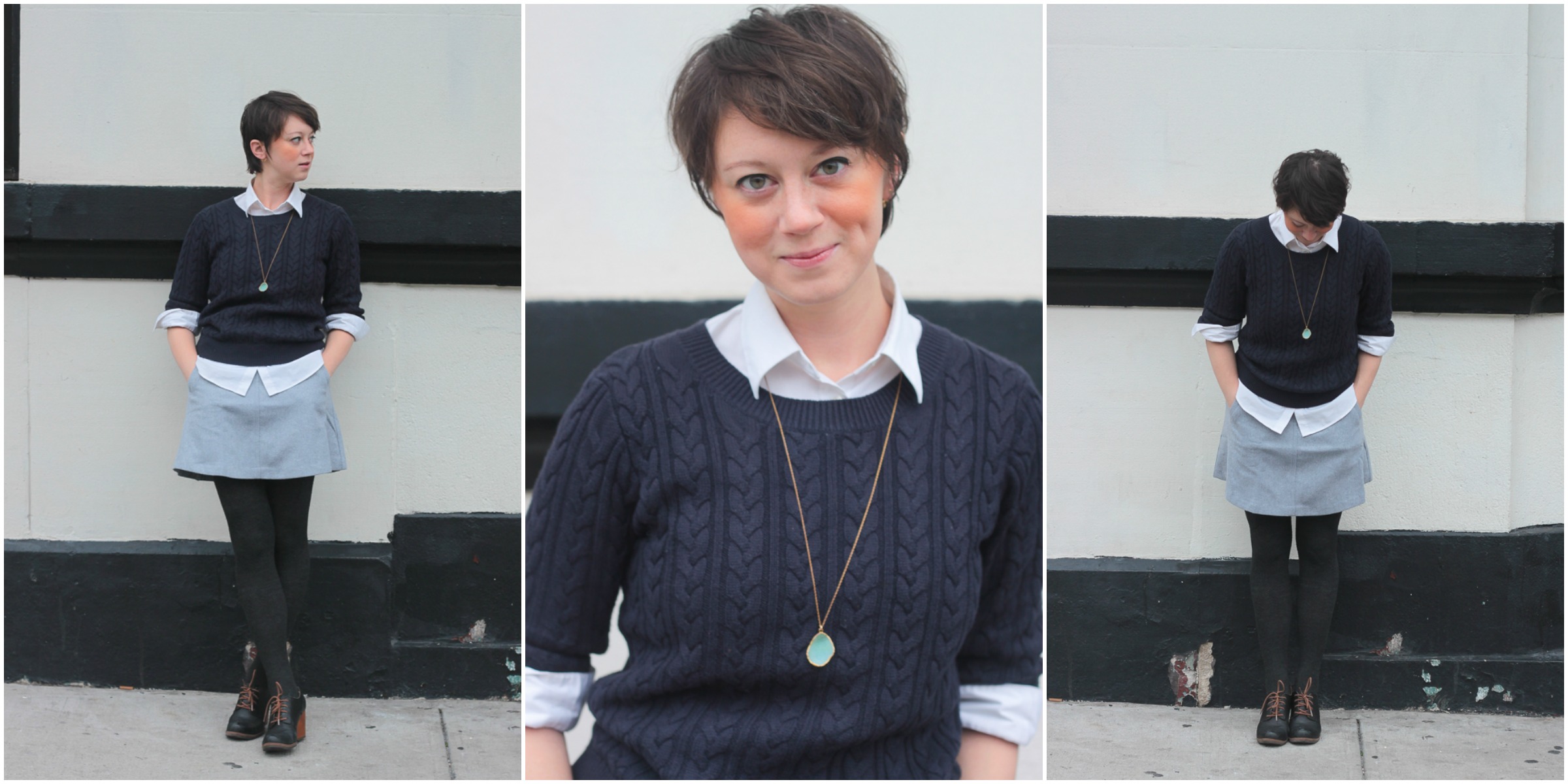 Uniqlo White Button Down / H&M Navy Cableknit Sweater (similar) / Ruche Grey Mini Skirt / Korks Black Wedges (their recent model)