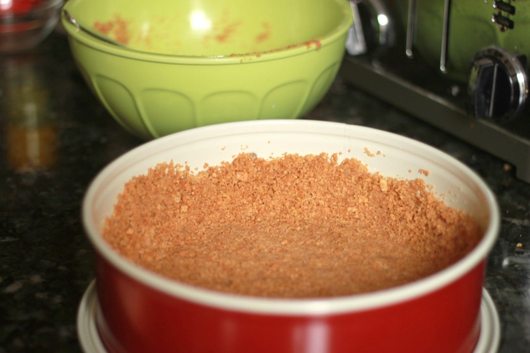 - Spread into 9 inch spring form pan and pat gently against the edges and along the bottom with a spoon or the bottom of a glass